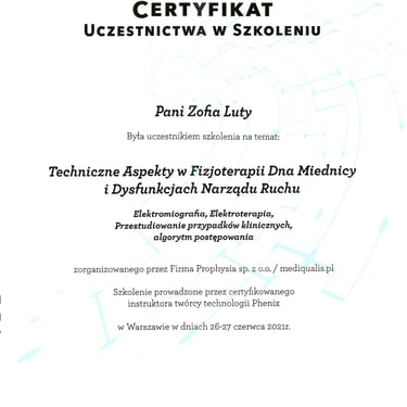Ważnym elementem diagnostycznym i terapeutycznym jest zastosowanie EMG (elektromiografia). Nowoczesny sprzęt, na którym pracuję, daje możliwość wykorzystania biofeedbacku oraz elektroterapii, co znacznie rozszerza możliwości terapii. Biofeedback pozwala na obserwację na ekranie komputera aktywności mięśni dna miednicy w czasie rzeczywistym oraz na poprawny i indywidualny trening w każdej pozycji. Natomiast elektrostymulacja w uzasadnionych przypadkach pomaga m.in. zwiększyć świadomość mięśni dna miednicy.